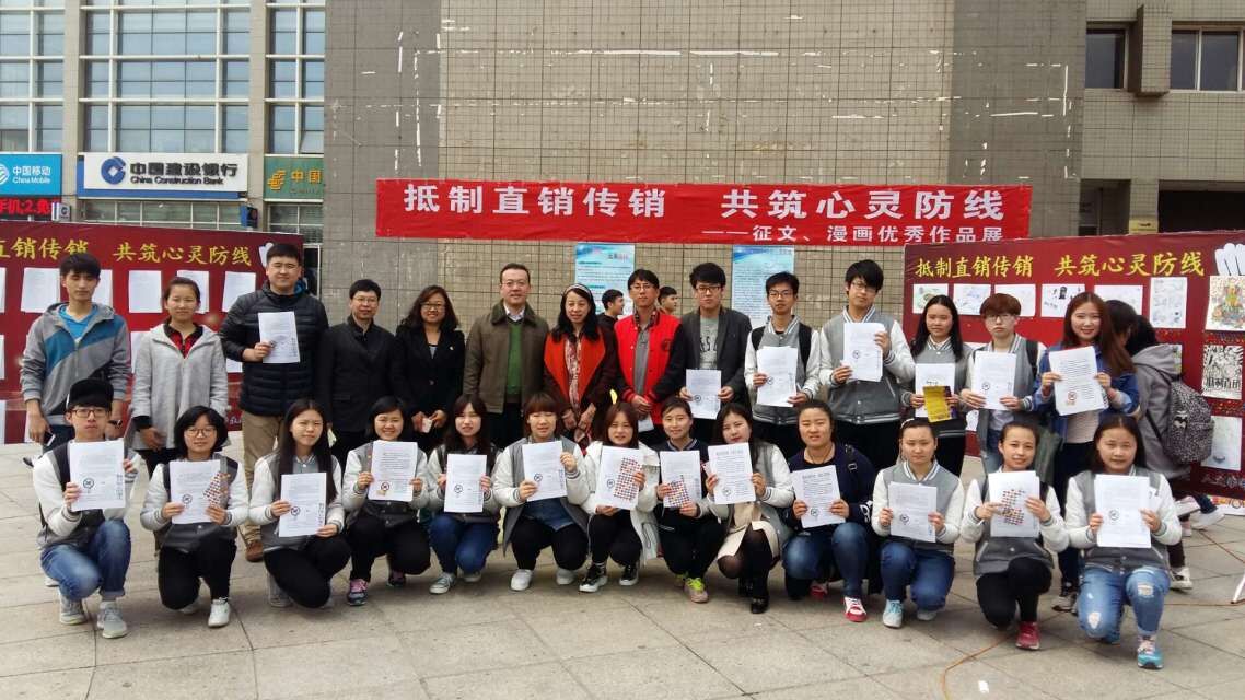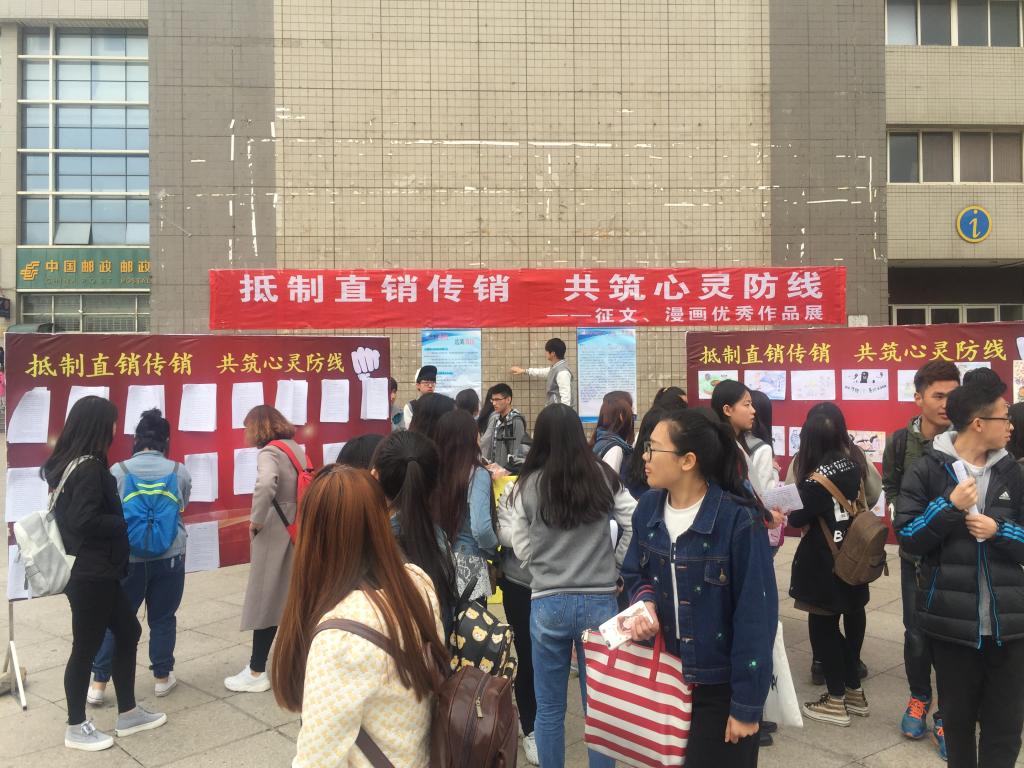 4月20日,“抵制直销传销,共筑心灵防线”主题征文、漫画作品展览于钟楼广场举行,学生处李春山处长、大学生心理咨询中心邹萍主任和部分学院辅导员莅临现场。该活动征集文字稿件百余份,漫画作品八十余份,最后各自评选出二十份优秀作品进行展览。为增加活动的参与性和互动性,还在现场进行了漫画一二三等奖投票环节和反传销宣传单的发放。往来的学生纷纷驻足观看投票,认真阅读宣传单,当天共发放宣传单千余份,参与投票上千人。