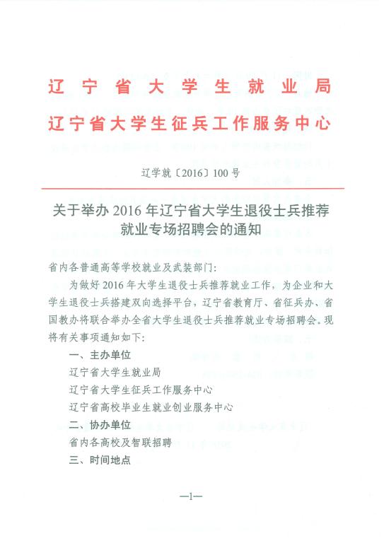 现将《关于举办2016年辽宁省大学生退役士兵推荐就业专场招聘会的通知》(辽学就2016[100]号)转发给你们,请按照通知要求,积极组织、推荐符合条件的人员参加。
